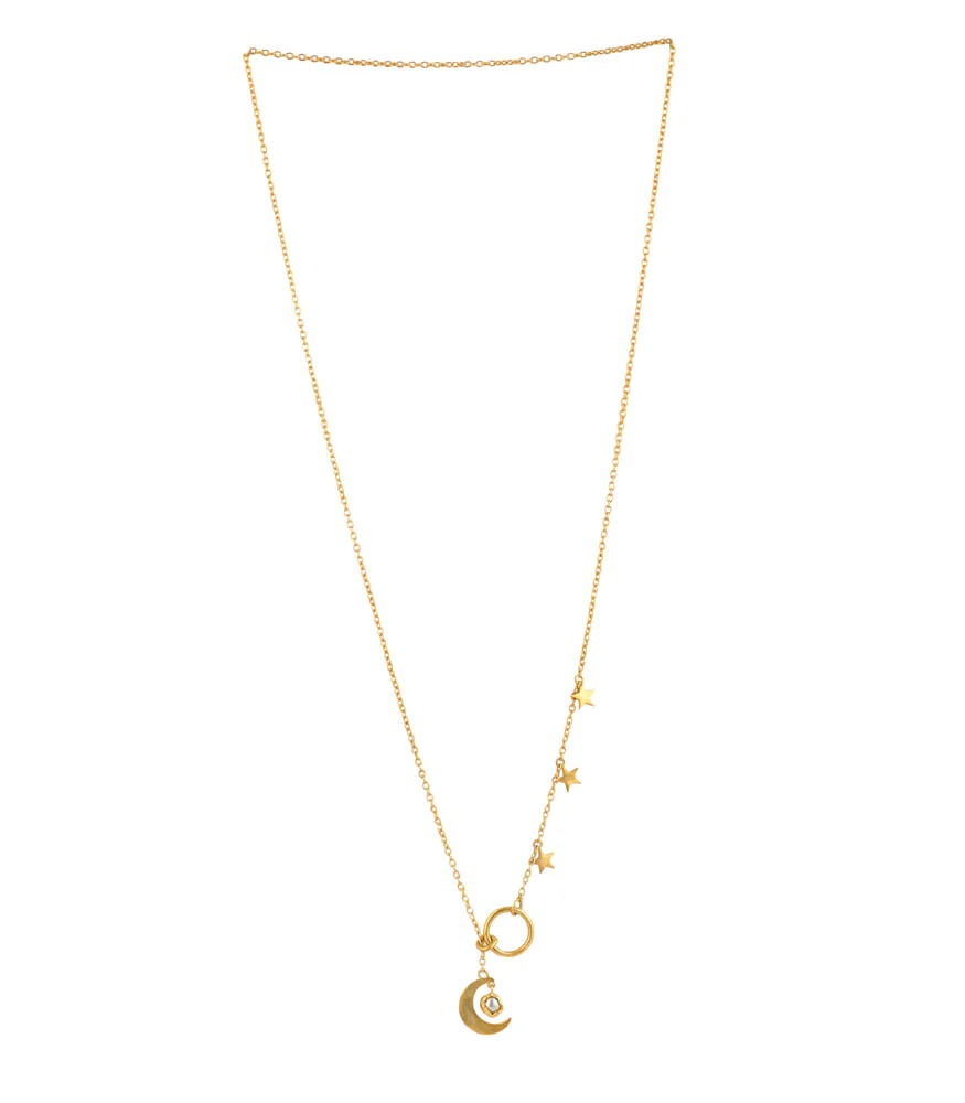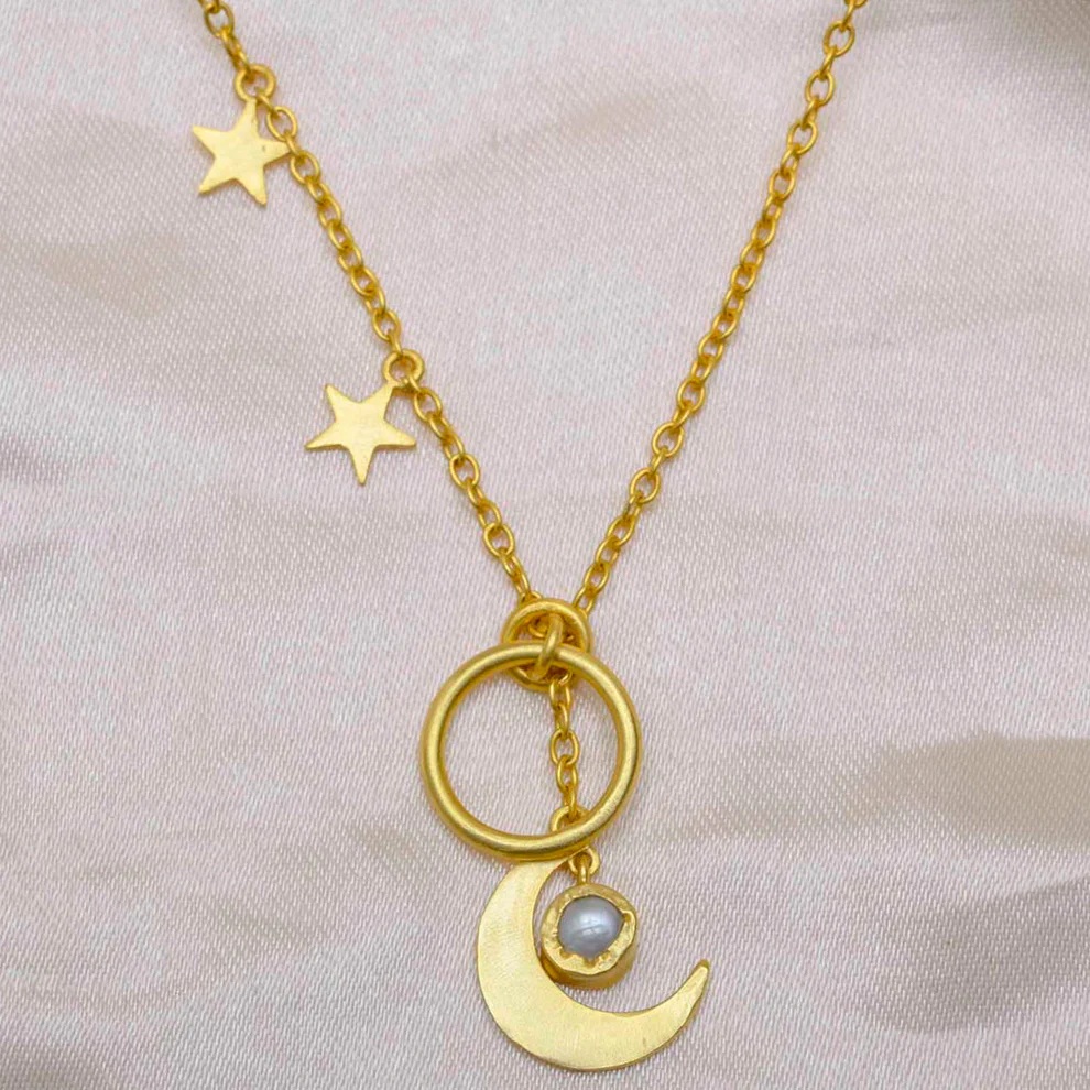 A delicate pendant necklace which holds a beautiful rough form of Pearl. The Pearl is encircled with a layer of stars that amps up the beauty, impact and sophistication of the piece.