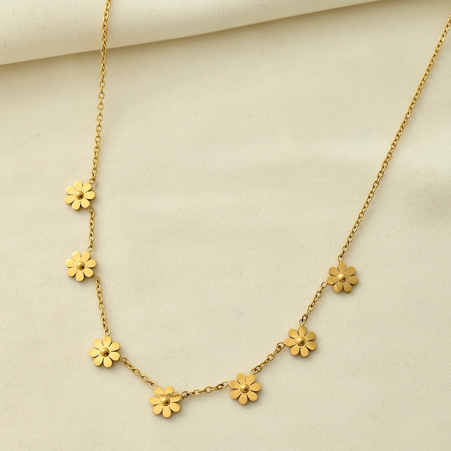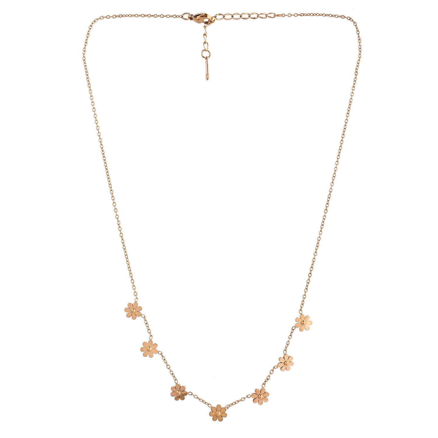 Introducing the Blossom Charm Gold Necklace from the Sparkling Elegance collection, a stunning piece crafted from high-quality stainless steel and plated with exquisite gold. This necklace features delicate flower-shaped pendants interspersed with tiny, intricate charms that add a playful yet elegant touch to the overall design. The charms are meticulously crafted to capture the essence of blooming flowers, making this necklace a perfect choice for any occasion. With its elegant gold color, this necklace adds a touch of sophistication and style, whether for everyday wear or special events. The versatile design ensures it pairs well with casual outfits, chic evening dresses, and even work attire. As a gift, the Blossom Charm Gold Necklace is a thoughtful and elegant choice for women, suitable for Valentine’s Day, Diwali, Rakshabandhan, Christmas, and other special occasions. Make a statement of grace and elegance with this beautiful necklace that is not just a piece of jewelry but a timeless symbol of beauty.